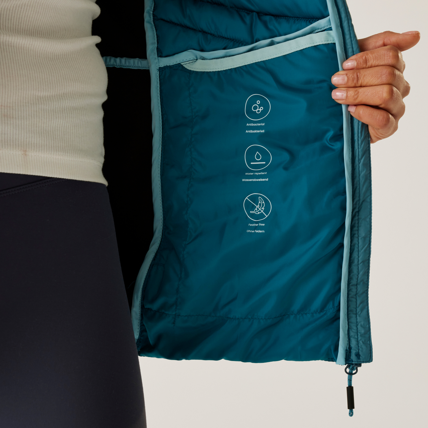 leichtes 20-Den-Material aus 100% Polyamid (35 g/m²) Extol-Stretcheinsätze aus 90% Polyester/10% Elasthan (235 g/m²) antibakterielle Ausstattung zur Geruchshemmung dauerhaft wasserabweisende Ausstattung hochwertige, synthetische Daunenwattierung - ohne Echtdaunen Isolationsgewicht (180 g/m²) Reach Technology - Unterarmzwickel für maximale Bewegungsfreiheit und ungehinderten Armhub fixierte Kapuze 2 tief angesetzte RV-Taschen Stretcheinfassung an Kragen und Saum Hergestellt aus recycelten Materialien